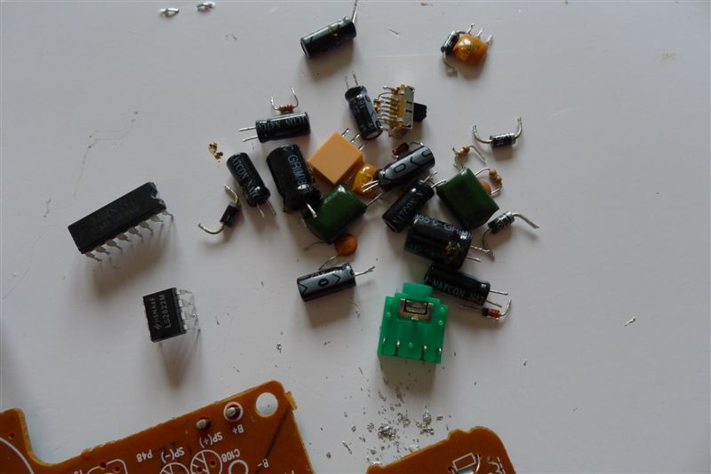 La radio ya fagocitada, he dejado los condensadores ceramicos y alguna resistencia, los condensadores electroliticos no parecen gran cosa...
