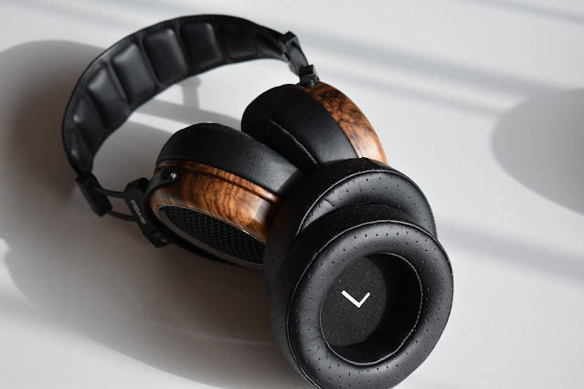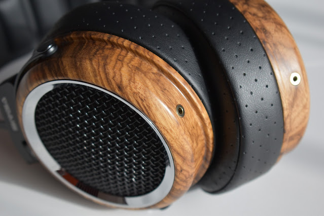 Las copas están hechas de madera Zebra, con horquillas de metal y bastante ajuste en cuanto a ángulo y giro. La diadema es de metal con una correa de confort debajo, sin embargo, esta es una de las primeras "cosillas", la longitud de la diadema y correa. En mi caso tengo que utilizar la correa ajustada a su máxima longitud. Esto es suficiente para mi personalmente y tengo la cabeza bastante grande, pero si tienes la cabeza más grande que yo, puede que lo encuentres un poco corto. De nuevo, no es mi caso pero es algo a tener en consideración.
